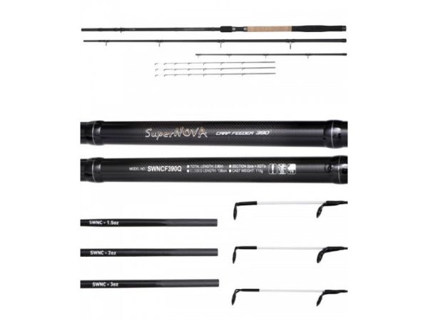 Supernova Carp Feeder predstavlja snažan i beskompromisan alat za pecanja šarana feeder sistemom. Oštar i jak štap, kakav i mora biti za method feeder, sa konusom koji ne pravi greške kod lansiranja teških hranilica na velike daljine. TB je deklarisana 110gr poseduje 16 SIC provodnika i težak je zaista respektabilnih 285gr. Poseduje 3 vrha od 1,5-2 i 3Oza i učiniće ribolov feeder metodom na šarana istinskim uživanjem. Uz štapove iz Supernova serije dobijaju se i kvalitetni neoprenski vezivačii (Rod Band) sa napisanim logom.