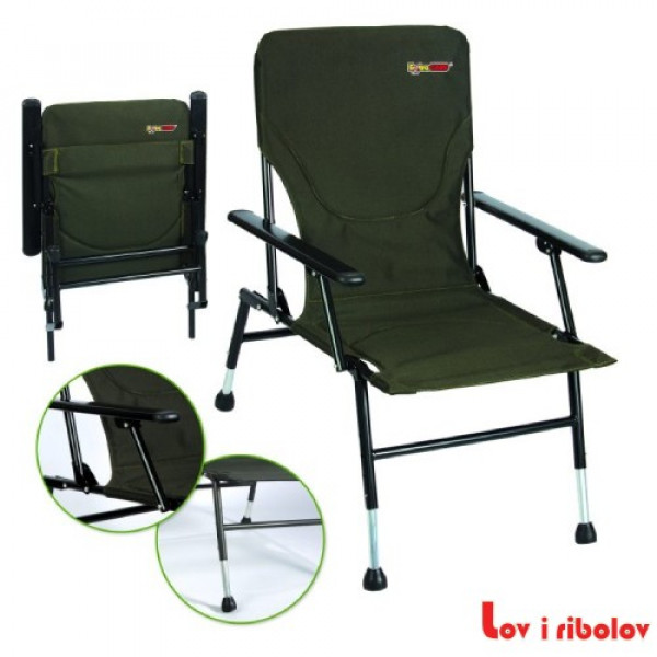 Stolica je izrađena od 500D tamno zelenog poliestera, otpornog na habanje i dugotrajnu upotrebu, a sa težinom od samo 4 kg, praktična je za nošenje i transport. Podesivi nogari omogućavaju stabilno postavljanje stolice čak i na neravnom terenu, dok naslon za ruke povećava udobnost i rasterećuje ramena.