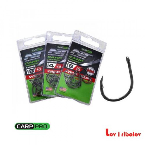 NT seriju udica proizvodi u SAD Eagle Claw Fishing Tackle Co. ekskluzivno za TM Carp Pro. Svaka udica je napravljena korišćenjem patentirane tehnologije hirurškog oštrenja (Eagle Claw Trokar hirurški oštrina tehnologija).Tehnologija vam omogućava da dobijete neverovatno oštro, trouglasto oštrenje uboda, tako da je prodor u usnu šarana 2 puta brži i lakši od bilo koje druge udice. Mat P.T.F.E. takođe igra značajnu ulogu za udice Carp Pro NT serije. premaz - zbog ove površine, udice ne daju odsjaj u vodi i ne plaše čak ni pažljivu ribu.Ovo je posebno važno kada se peca u plitkoj vodi. Hooks Carp Pro Vide Gape Heavi Duti je modifikovana forma klasične udice kao što je Wide Gape, ali sa širim grlom i skraćenim vratom.Koristi se u svim instalacijama šarana, osim Chod i Stiff Rig. Količina: 10 kom.