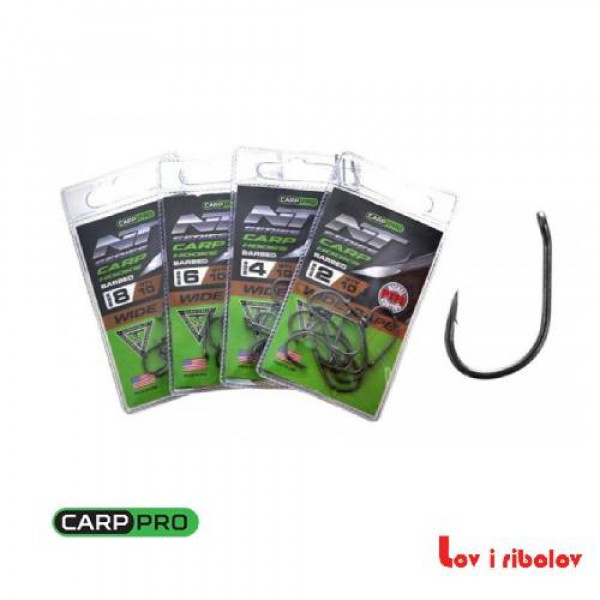 NT seriju udica proizvodi u SAD Eagle Claw Fishing Tackle Co. ekskluzivno za TM Carp Pro. Svaka udica je napravljena korišćenjem patentirane tehnologije hirurškog oštrenja (Eagle Claw Trokar hirurški oštrina tehnologija).Tehnologija vam omogućava da dobijete neverovatno oštro, trouglasto oštrenje uboda, tako da je prodor u usnu šarana 2 puta brži i lakši od bilo koje druge udice. Mat P.T.F.E. takođe igra značajnu ulogu za udice Carp Pro NT serije. premaz - zbog ove površine, udice ne daju odsjaj u vodi i ne plaše čak ni pažljivu ribu.Ovo je posebno važno kada se peca u plitkoj vodi. Hooks Carp Pro Vide Gape Heavi Duti je modifikovana forma klasične udice kao što je Wide Gape, ali sa širim grlom i skraćenim vratom.Koristi se u svim instalacijama šarana, osim Chod i Stiff Rig.